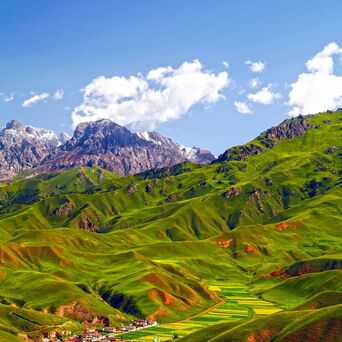 图⑦:卓尔山地处青海省海北藏族自治州祁连县,紧靠八宝河,与牛心山隔河相望。这里属于丹霞地貌,红色的砂岩、砾岩与油菜花田、草原,共同构成了多彩的“山间油画”。
