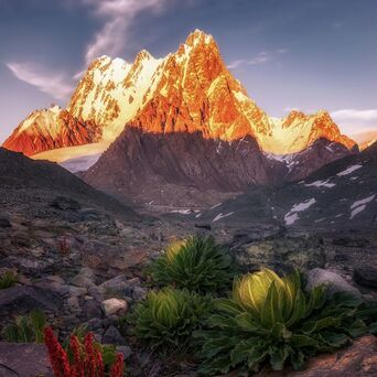 图③:博格达峰在新疆维吾尔自治区阜康市,海拔5445米,其峰型似一座笔架,在众雪峰之中较罕见。这里常年积雪,却有雪莲等植物盛开,纯洁空灵。