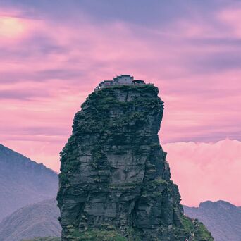 图⑥:位于贵州铜仁的梵净山是武陵山脉的主峰。高耸入云的梵净山主要由变质岩组成,周围被广阔的喀斯特地貌环绕,是矗立在喀斯特海洋中的变质岩“孤岛”。
