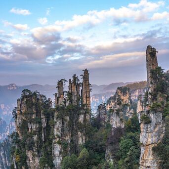 图⑧:张家界以其石英砂岩构成的石柱地貌最为著名。这之中,石英砂岩峰林集中分布于武陵源天子山,3000余根峰柱拔地而起,蔚为壮观。