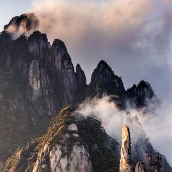 图②:三清山位于江西省上饶市,是远近闻名的花岗岩名山。上亿年的地壳抬升、风雨侵蚀将花岗岩岩体塑造出多样的景观,石峰群、石柱、石锥……形态各异,与云海、茂林相映成趣。